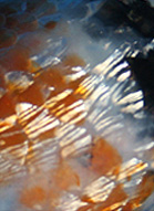 | Ginrin scales are quite different from those on metallic koi. Instead of an overall gleam caused by the reflective pigment guanine, Ginrin scales have a reflective sheen over all or part of their surface creating a glimmering effect. The color they appear is determined by the pigment they overlay - silver (Gin) in the case of sumi or white, and golden (Kin) over hi. More than one type of Ginrin scale can appear on the same fish. Beta-Gin is usually found on the abdomen, along the lateral line or in individual rows toward the dorsal surface. Diamond and Kado-Gin tend to cover the back of the koi. Most hobbyists today do not differentiate between the types of Ginrin, but accept them as already beautiful koi. |