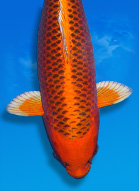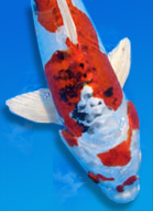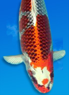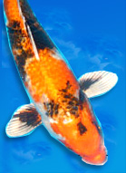 KOI COLOR: Koi colors change throughout their road to maturity. All koi color comes from three types of pigment color mix: black, red, or yellow. It is advised to feed your koi color enhancing food to bring out these three natural pigments, especially during summer, when koi have heartier appetites. To protect their color, it is important to provide the most optimum underwater environment for your koi. If there is an abundance of pollutants (ammonia, nitrites, nitrates), your koi's color and vibrancy will fade. pH levels also have an effect on koi color. High pH levels of 8.0+ will cause your koi's black pigment to appear softer, while a more acidic pond water, around 6.0-7.0pH, will cause your koi's red pigment to fade. Hardness of the water plays a role as well. Soft water affects red pigment, while harder water fades out black pigment. Koi color is richer in spring and fall months, when water temps are slightly cooler.  |