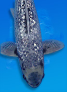 | About 30 years ago, when koi keeping began to take off outside of Japan, the Bekko variety was quite fashionable, but like most fads, the popularity of this koi diminished over time. Though they may be hard to find, good specimens are truly stunning in their simplicity. Out of the three types of koi that are recognized as Bekko, only one - the Shiro Bekko - is widely known. Shiro Bekko is a Sanke derivative. Although they are still produced from parent fish of this variety, they are just as likely to be seen from spawnings of Sanke, especially Tancho Sanke. Bear in mind that any hi at all on a Shiro Bekko, even on the lips, technically makes it a Sanke. |