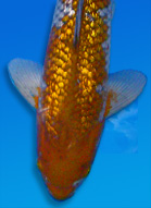 | Matt-scaled Matsuba are grouped in Kawarimono, but their metallic equivalents are benched Hikarimono. The most commonly available are Kin Matsuba (metallic gold/yellow, first produced in 1960) and the Gin Matsuba, its silver equivalent. Platinum (white) Matsuba and Aka Matsuba Ogon are not often seen. The pinecone scalation must be pronounced; if the black is more of a gray, these koi look washed out. Beginners are often confused by the Doitsu Matsuba Ogon, as the scale reticulation is not present. Instead, the black, German scales are aligned in the usual position, where they contrast sharply with the metallic body. Orange Doitsu Ogonare very rare. |